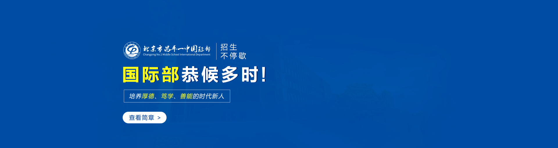 昌平一中国际部倡导学生的全面培养与人本教育,关注个体发展的完整性,目标是帮助中国学子在知识、素养、能力等全方位装备,在计划时间内顺利进入国外优秀学府就读,并发展成为具有社会竞争力的国际型人才。